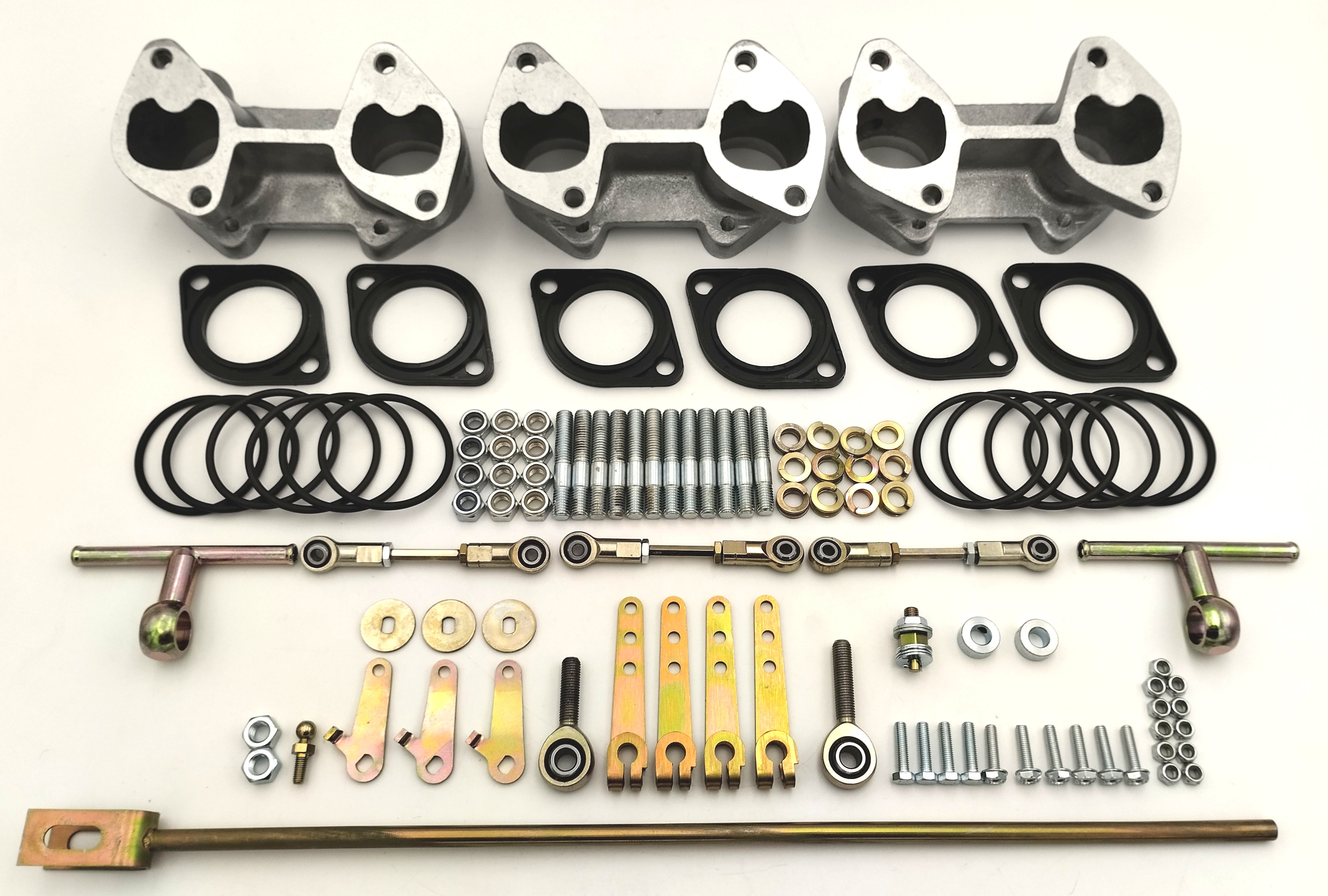 Manfold and linkage set to allow fitment of 3 x Weber DCOE carburettors to BMW 6 cyl 2.8 / 3.2 and 3.5 ltr engines.